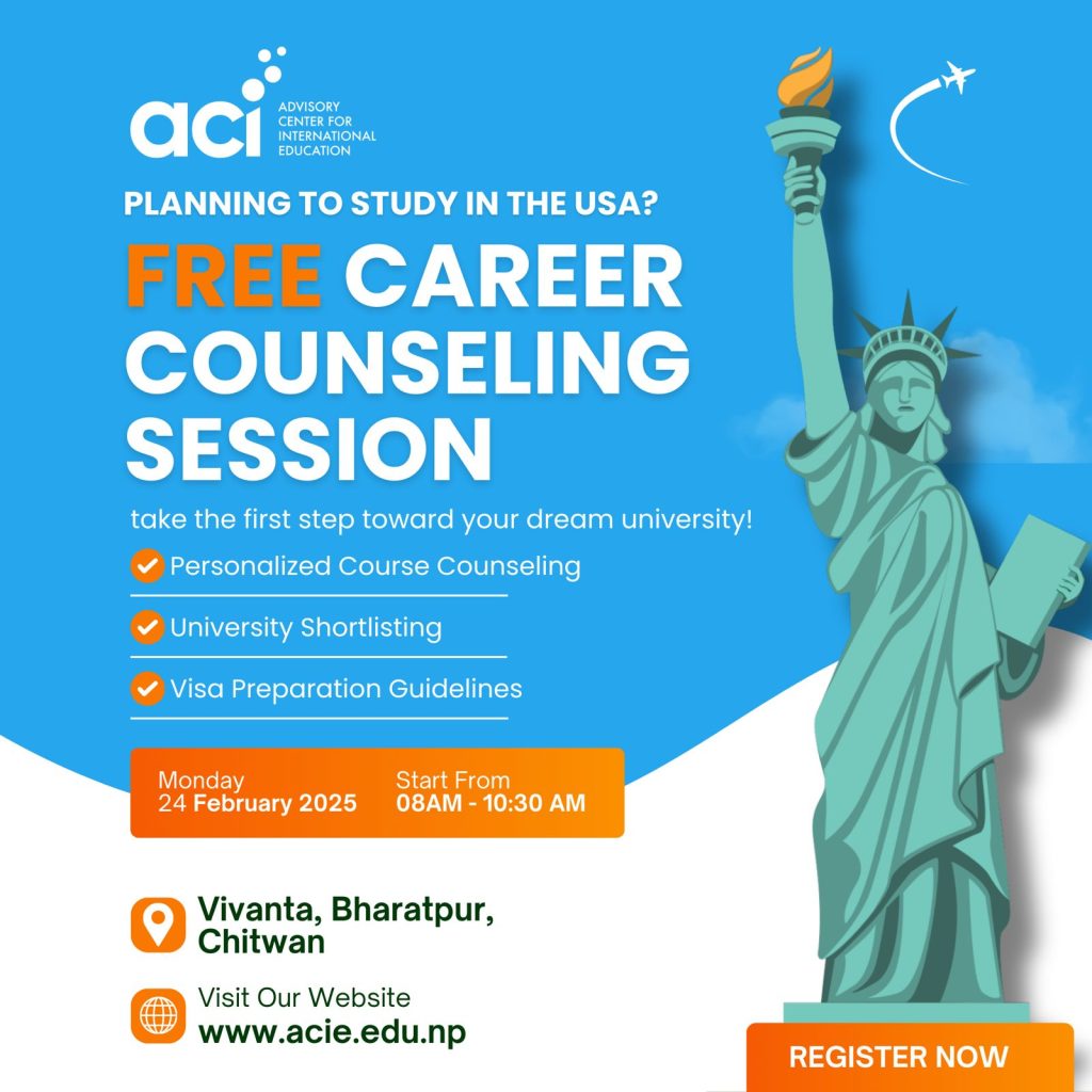 Exclusive Career Counseling in Chitwan-Study in the USABy Acie Marketing / February 19, 2025 Chitwan students, your American dream starts here! 🎓 If you’re planning to study in the USA, this is your chance to get expert visa guidance & career counseling fromMr. Sabin Joshi, an education expert with 18+ years of experience. Register Now ! Notice: JavaScript is required for this content.